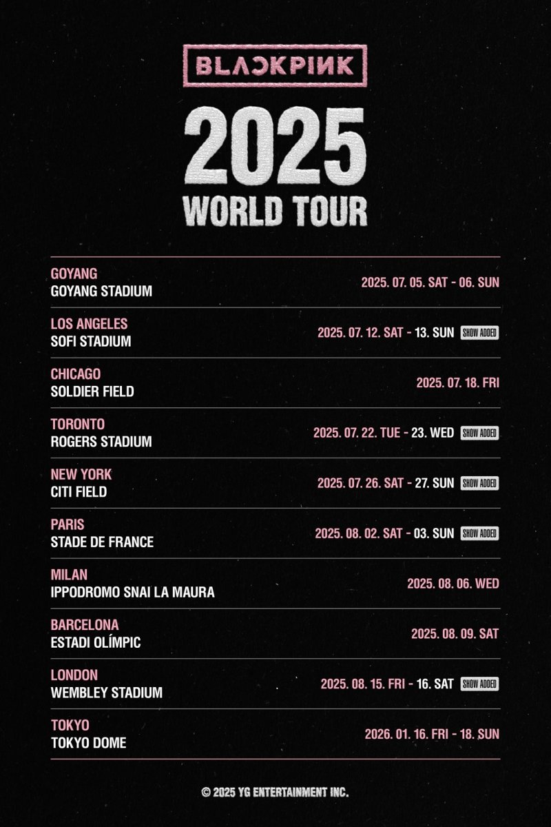 이로써 블랙핑크는 2025 월드투어를 통해 총 10개 도시, 18회 차에 걸쳐 팬들을 만나게 됐다. 앞서 이들은 오는 7월 5일과 6일 고양종합운동장 주경기장을 시작으로 12일 로스앤젤레스, 18일 시카고, 22일 토론토, 26일 뉴욕, 8월 2일 파리, 6일 밀라노, 9일 바르셀로나, 15일 런던, 내년 1월 16·17·18일 도쿄로 이어지는 투어 일정을 발표한 바 있다.