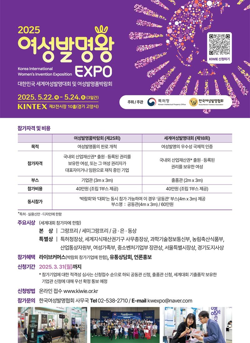 올해로 8회째를 맞은 여성발명왕EXPO는 세계여성발명대회(제18회)와 여성발명품박람회(제25회)를 통합해 여는 행사이다. 전 세계 여성들의 우수한 아이디어를 한 자리에서 만나볼 수 있는 자리로, 창의적 혁신을 촉진하는 교류의 장으로 자리매김하고 있다. 올해는 발명의 날(5월 19일) 60주년 기념 주간인 5월 22~24일까지 경기도 고양 킨텍스 2전시장 10홀에서 열린다.