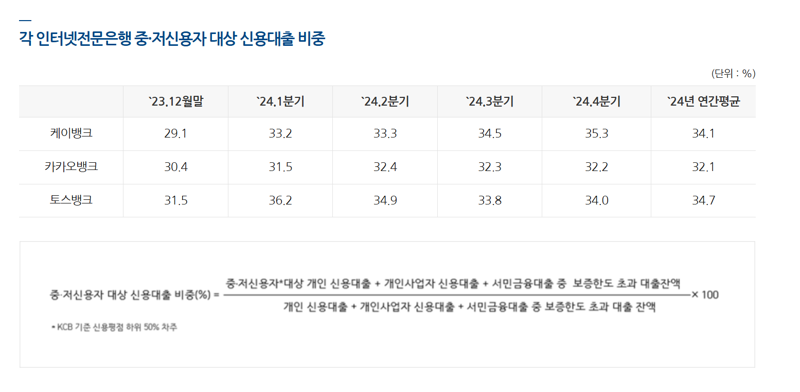 28일 금융권에 따르면 카카오뱅크는 지난해 2년 연속 인터넷전문은행 중·저신용 대출 공급 계획 목표를 달성했다. 카카오뱅크의 지난해 말 기준 중·저신용 대출 평잔 약 4조9000억원으로 집계됐자. 비중은 32.2%로 중·저신용자 대출 공급 목표치인 4조8193원, 30% 이상을 웃돌았다. 카카오뱅크는 앞서 지난 2023년에도 인터넷전문은행 중 유일하게 중·저신용 대출 공급 목표를 달성한 바 있다.