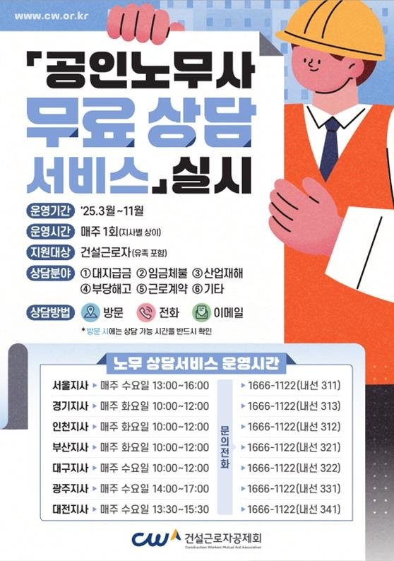 '임금체불·부당해고' 건설근로자에 공인노무사 무료상담 해준다건설근로자공제회 11월까지 전국 7개 지사서 매주 1회 제공
