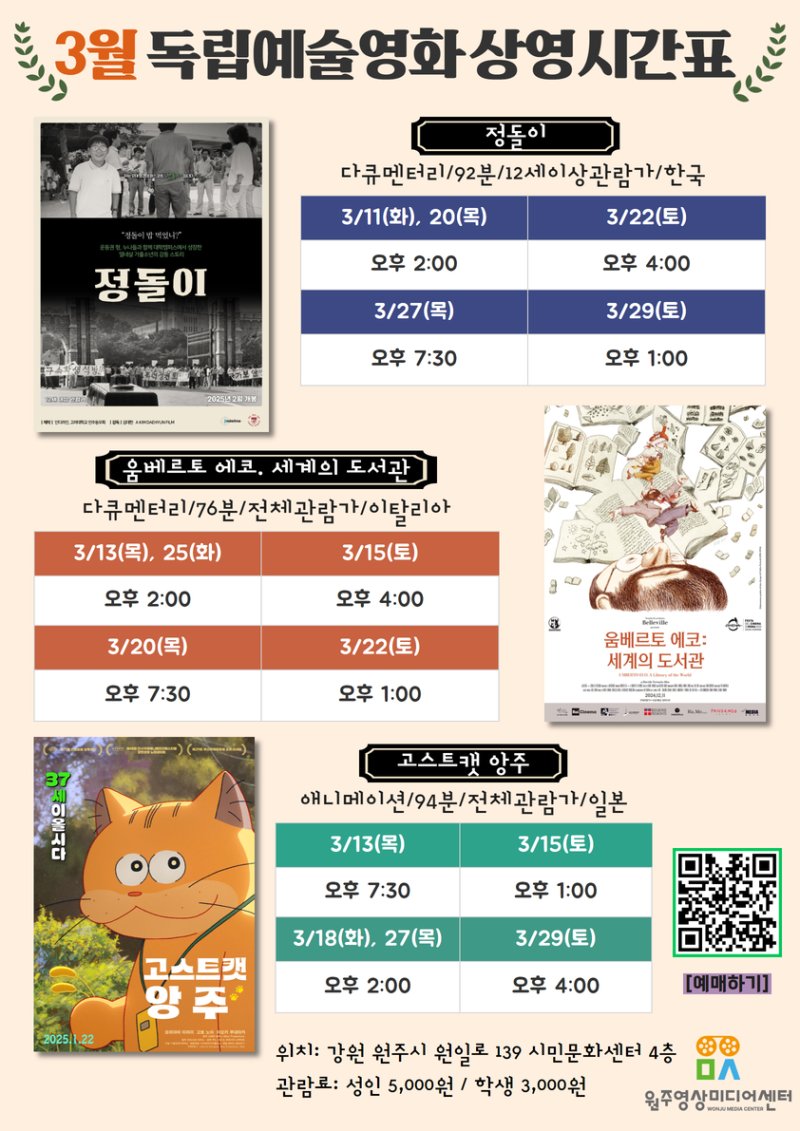 [원주=뉴시스]이덕화 기자 = 원주영상미디어센터는 오는 11일부터 ▲정돌이 ▲움베르트 에코, 세계의 도서관 ▲고스트캣 앙주 등 독립예술영화 3편을 상영한다고 4일 밝혔다.
