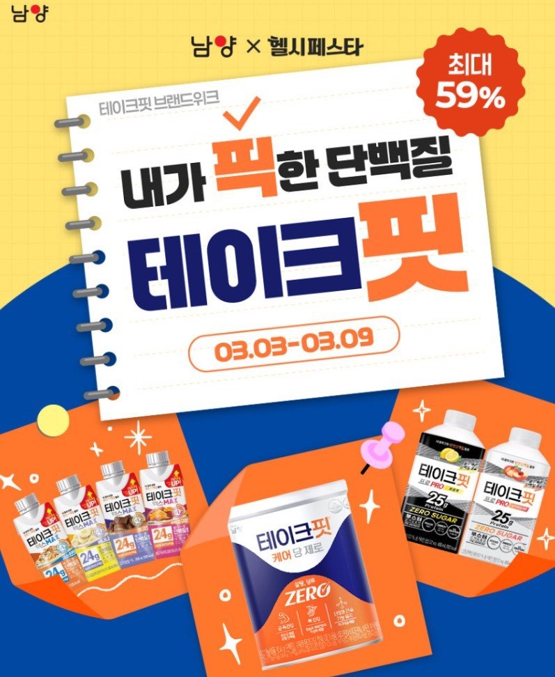 남양유업의 단백질 음료 '테이크핏 맥스', 건강기능식품 '테이크핏 케어 당제로' 등 브랜드 라인업 전 제품을 최대 59% 할인된 가격에 구매할 수 있다.
