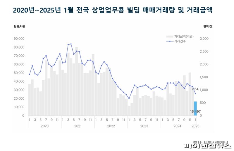 4일 부동산플래닛에 따르면 1월 전국의 상업업무용 빌딩 거래량은 854건으로 전월(1130건) 대비 24.4% 하락하며 2023년 1월(668건) 이후 2년여만에 최저를 기록했다. 거래금액은 전월(3조3431억원)에 비해 50.7%가 하락한 1조6497억원에 머물렀다. 이는 2023년 2월 이후 가장 낮은 규모다.