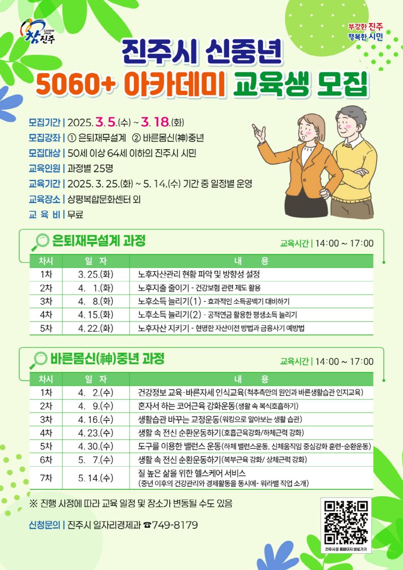 [진주=뉴시스] 정경규 기자 = 경남 진주시는 5일부터 18일까지 ‘신중년 5060+아카데미’ 교육생을 모집한다.