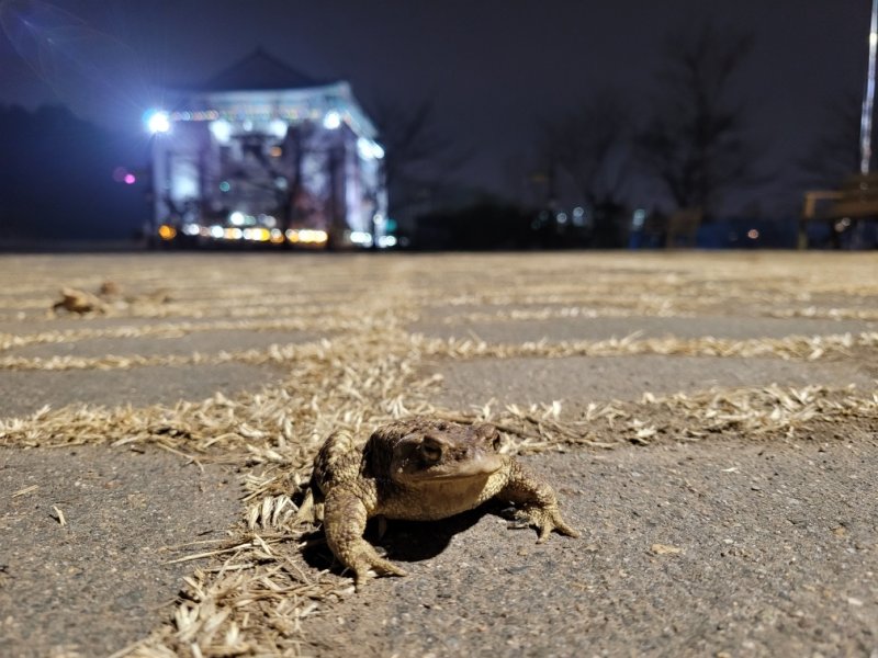 최근 봄을 재촉하는 비가 내려 땅이 축축하고 기온이 영상권으로 오르자 두꺼비들이 산란을 위해 이동한 것으로 보인다.