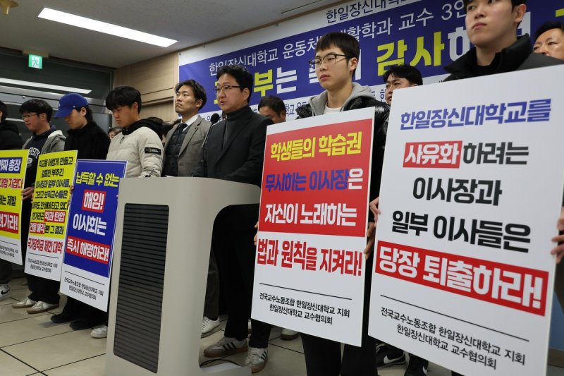 전국교수노동조합 한일장신대 지회는 4일 전북자치도교육청에서 기자회견을 열고 "자격이 없는 총장직무대행이 운동처방재활학과 교수 3명을 부당 해임했다"며 "독단적인 학교 운영을 중단하라"고 촉구했다.