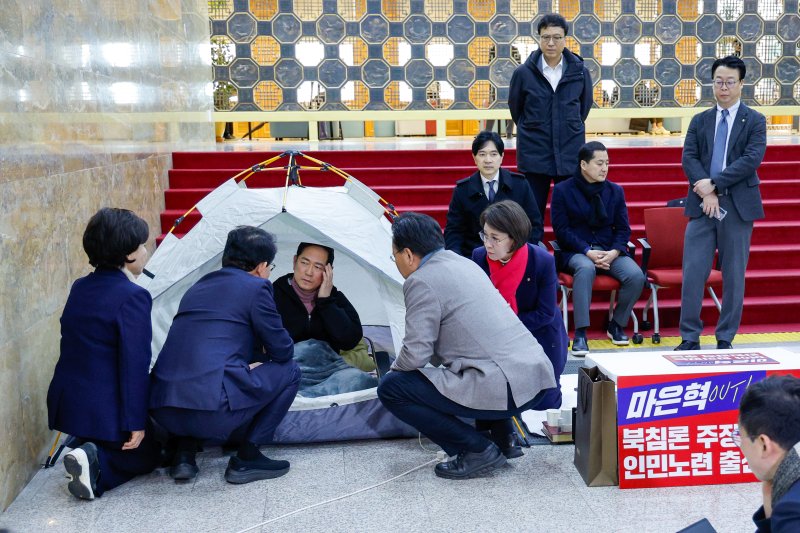 국회 기획재정위원장인 송언석 의원을 비롯해 기재위 소속 여당 의원들은 이날 국회 본회의장 앞 로텐더홀에 마련된 박수영 의원 단식 농성장을 찾아 "마 후보자 임명은 절대 안 된다"고 목소리를 높였다.