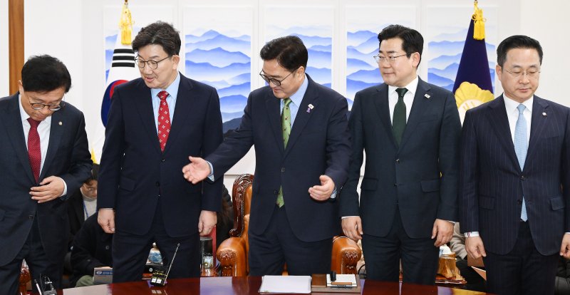 박형수 국민의힘 원내수석부대표(왼쪽부터)와 권성동 원내대표, 우원식 국회의장, 박찬대 더불어민주당 원내대표, 박성준 원내수석부대표가 4일 서울 여의도 국회에서 열린 국회의장 주재 여야 원내대표 회동에 참석해 기념촬영을 한 뒤 각자 자리로 향하고 있다. (공동취재) 2025.3.4/뉴스1 ⓒ News1 이광호 기자