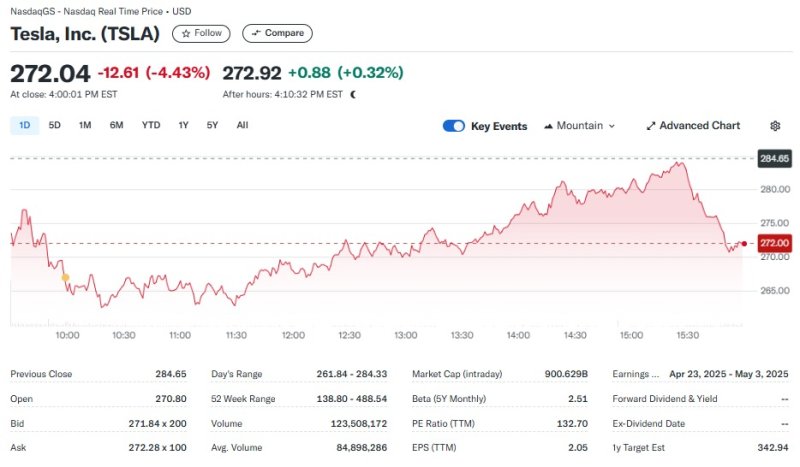 일단 테슬라는 4.43% 급락한 272.04달러를 기록했다. 이로써 시총도 9006억달러로 줄었다. 이는 미국 기업 중 시총 8위에 해당한다.