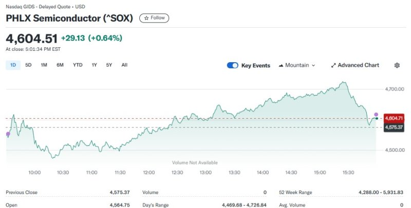4일(현지시간) 뉴욕증시에서 반도체지수는 0.64% 상승한 4604.51포인트를 기록했다.