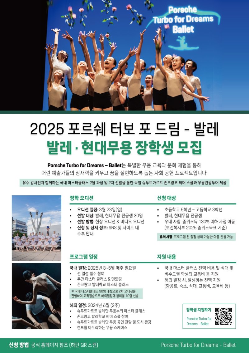 '포르쉐 터보 포 드림-발레'는 인재 양성 사회공헌 프로그램이며 포르쉐 본사가 있는 독일 슈투트가르트에서 발레 캠프를 진행할 예정이다.