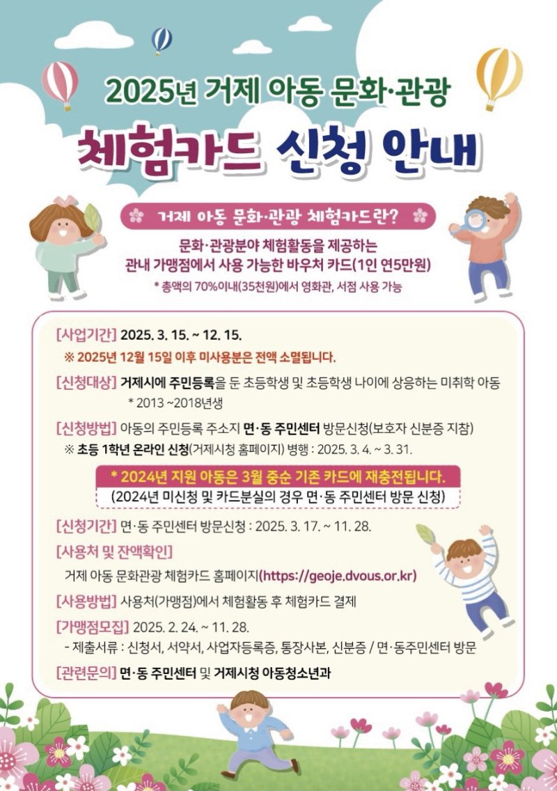 다만 2024년 지원받은 아동 중 현재 거제시 거주 아동은 별도 신청 없이 기존 발급받은 카드에 5만 원이 재충전 되며 2024년 카드 미신청 및 분실의 경우 면·동 주민센터에 방문 신청해야 한다.