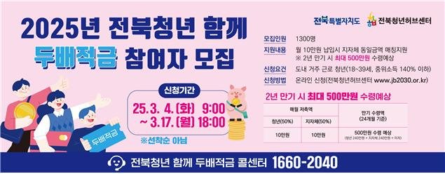 '전북청년 함께 두배적금'은 청년이 매월 10만원을 저축하면, 전북자치도가 동일한 금액 10만원을 추가 적립해 2년 후 최대 500만원(원금 480만 원+이자)을 수령할 수 있는 자산 형성 지원 사업이다.