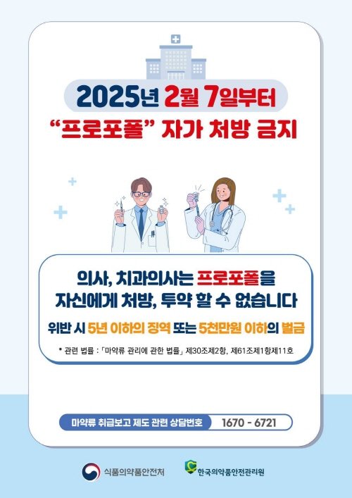 식약처는 의료용 마약류 오남용을 방지하기 위해 오는 7일부터 의사가 프로포폴을 셀프 처방할 수 없도록 금지했다. 펜타닐뿐만 아니라 주요 오남용 성분까지 투약 내역 확인 대상으로 지정하기 위해 의료단체와 협의를 추진하는 등 의료용 마약류 안전관리를 강화할 계획이다.