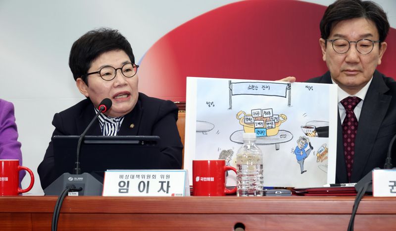 임이자 국민의힘 비상대책위원이 27일 여의도 국회에서 열린 비상대책위원회의에서 “이재명과 민주당은 희대의 정치 공작인 김대업 사건 같은 명태균 특검법을 가지고 명태탕을 끓이고 있다”며 “재탕 삼탕 끓인 명태탕은 맹탕이 될 것이고 헛발질이 될 것이 분명하다”고 말했다.