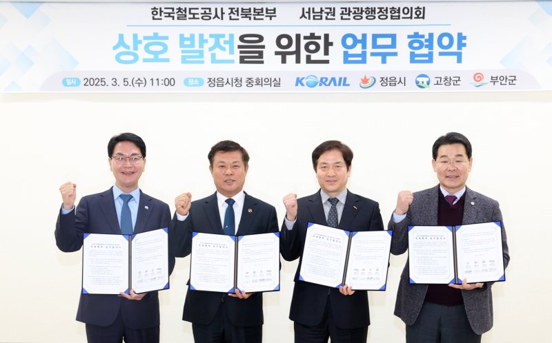 5일 정읍시청에서는 지난 2003년 '서남권관광행정협의회'를 구성했던 3시·군의 이학수 정읍시장과 심덕섭 고창군수, 권익현 부안군수를 비롯해 한국철도공사 이두희 전북본부장 등이 참석한 가운데 '서남권-한국철도공사 전북본부 상생협력 업무협약'이 체결됐다.