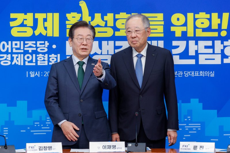 이 대표는 이날 오후 국회에서 열린 '한국경제인협회 민생경제 간담회'를 주재하고 류 회장을 비롯한 한경협 주요 임원진과 회동을 가졌다. 2015년 이후 10년 만에 이뤄진 민주당 대표와 한경협 간 회동에는 진성준 정책위의장, 정성호 의원, 조승래 수석대변인 등 당 인사들도 대거 동석했다.