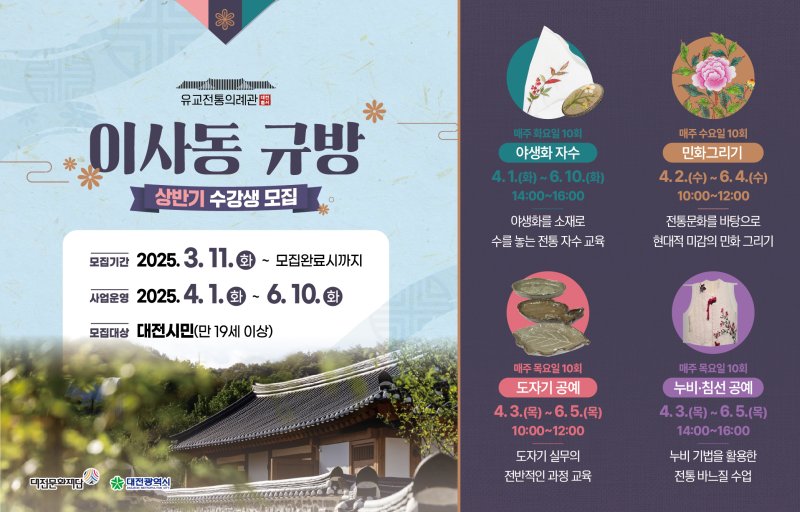 (대전=뉴스1) 김기태 기자 = 대전문화재단이 운영하는 유교전통의례관 '대전별서'는 상반기 교육 프로그램에 참여할 개인·단체를 모집한다.