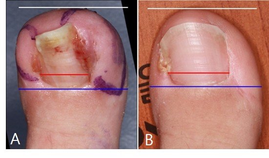 분석 결과 연부조직 절제 후 발톱 폭의 비율이 최대 52.52%(평균 22.68%)까지 개선되는 것으로 나타났다. 상처 회복기간은 평균 35.58일로 모두 2달 이내 회복됐다.