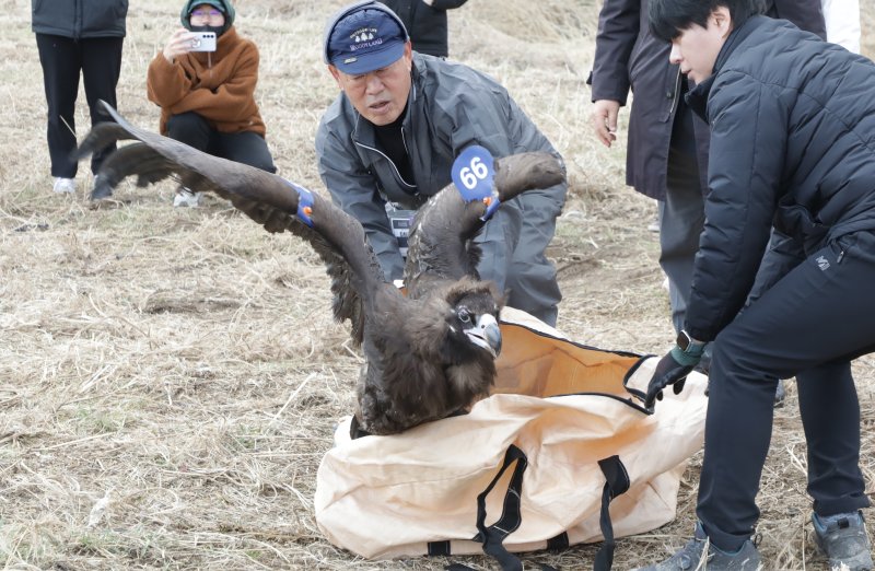 성인 남성 두 명이 나눠 든 자루를 열자, 날개에 97번 번호를 단 독수리가 힘찬 날갯짓을 하며 날아올랐다.