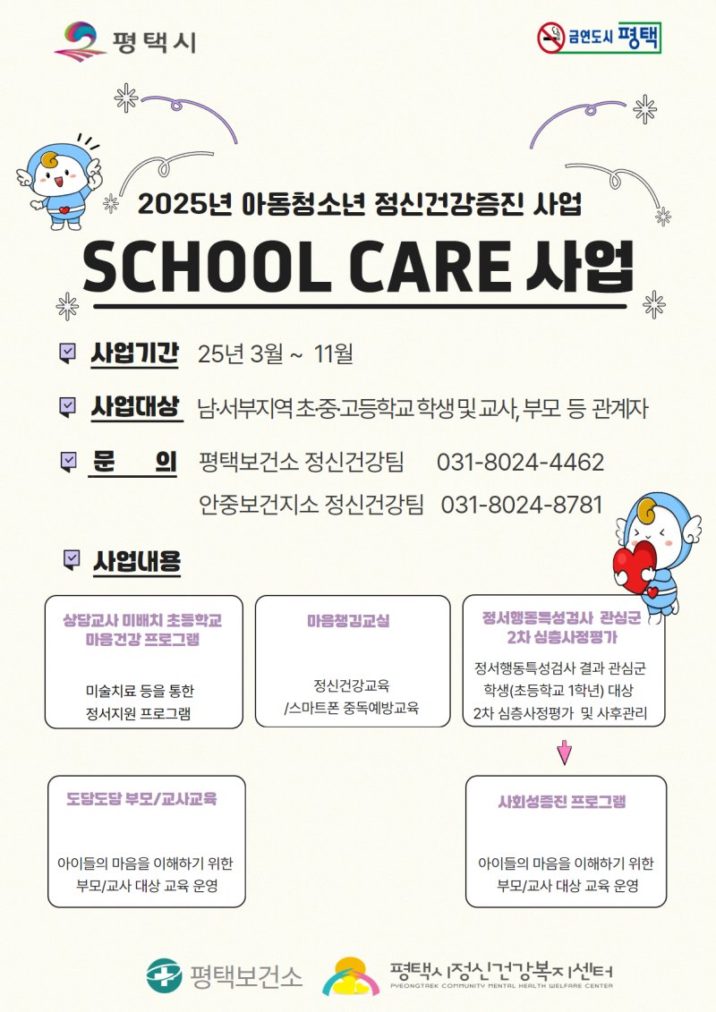 [평택=뉴시스] 신정훈 기자 = 경기 평택시는 학교 내 정신건강 문제를 경험한 아동·청소년의 정신건강과 예방을 지원하기 위해 ‘School Care 사업’을 운영한다고 6일 밝혔다.