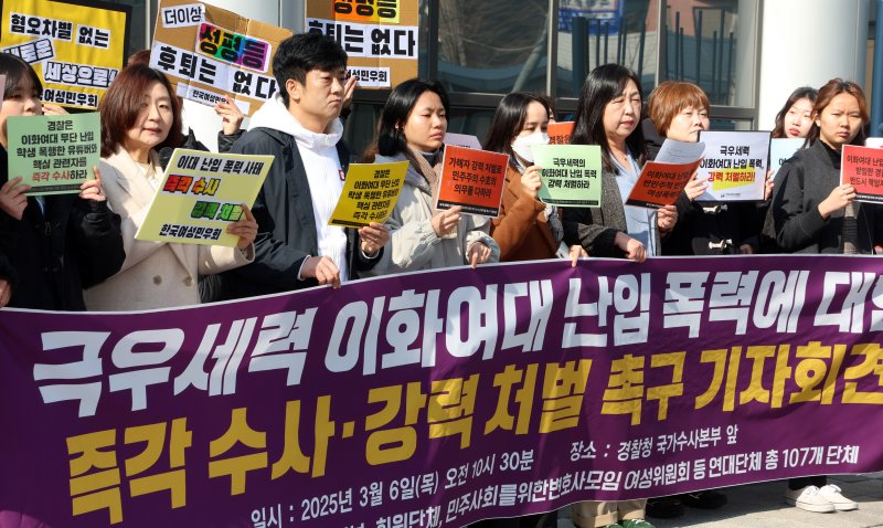 (서울=뉴스1) 박혜연 기자 = 여성단체들이 지난달 26일 극우 시위대의 이화여대 난입 사건과 관련해 경찰의 즉각 수사와 처벌을 촉구했다.