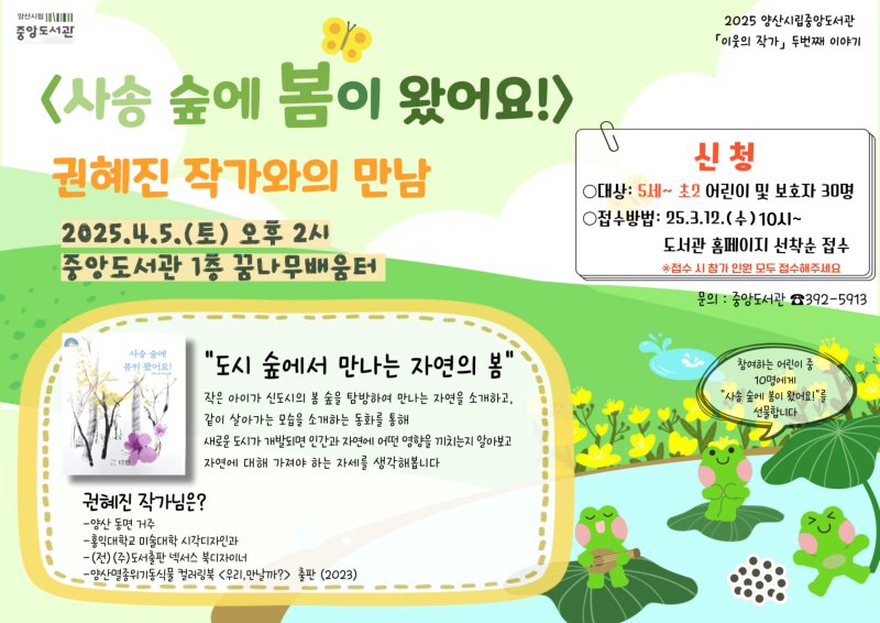 사송 숲에 봄이 왔어요!는 아이가 신도시의 봄 숲을 탐방하며 만나는 자연을 소개하고, 자연과 인간이 함께 살아가는 모습을 그린 생태동화다. 권혜진 작가는 아이들과의 만남을 통해 자연에 대해 가져야 하는 자세에 대해 이야기를 나눌 예정이다.