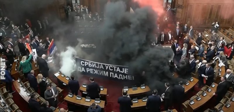 5일(현지시간) AFP통신 등에 따르면, 지난 4일 세르비아 의회에서 야당 의원들이 의사당 곳곳에 최루탄과 조명탄을 투척했다. 세르비아 의회가 공개한 영상을 보면, 의사당 안에 검은 연기와 분홍색 연기가 피어오르는 가운데 일부 야당 의원들은 '세르비아 정권을 무너뜨리기 위해 일어선다'는 문구가 담긴 현수막을 펼쳐들었다.