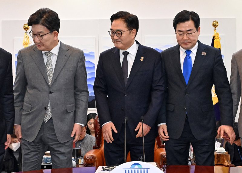 우원식 국회의장(가운데)과 권성동 국민의힘 원내대표(왼쪽), 박찬대 더불어민주당 원내대표가 6일 오후 서울 여의도 국회에서 열린 여·야 국정협의회에 참석해 기념 촬영을 마친 뒤 자리로 향하고 있다. (공동취재) 2025.3.6/뉴스1 ⓒ News1 안은나 기자 /사진=뉴스1