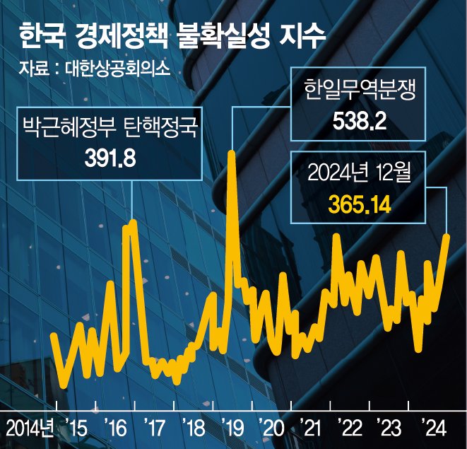 경제정책 불확실성은 5년 만에 최고 수준이다. 이날 대한상공회의소 지속성장이니셔티브(SGI)가 발표한 '경제정책 불확실성이 투자에 미치는 영향과 시사점' 보고서에 따르면 지난해 12월 경제정책 불확실성 지수는 10년 전인 2014년 12월 107.76 대비 3.4배로 상승한 365.14를 기록했다.