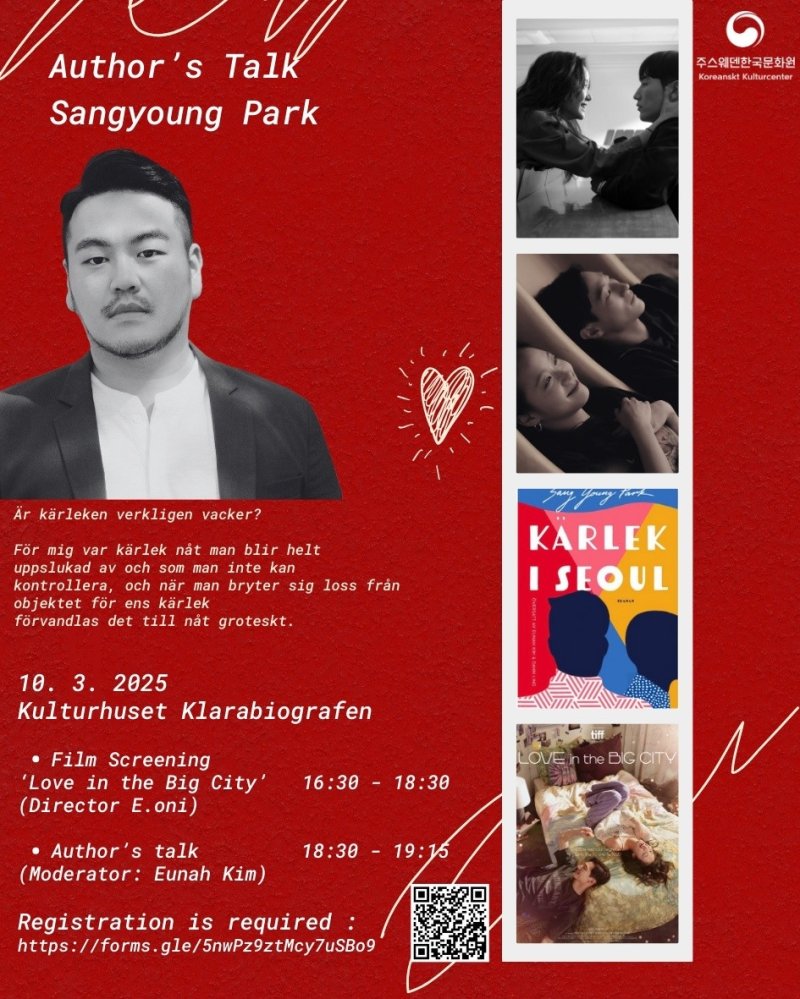 박상영은 10일 스톡홀름 소재 복합문화공간인 쿨투르후세트(Kulturhuset)에서 자신의 소설을 기반으로 한 영화 '대도시의 사랑법' 상영 뒤 현지 독자들을 만난다. 소설 '대도시의 사랑법'의 스웨덴어 번역가인 김은아가 행사 진행을 맡는다.