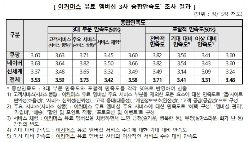 7일 한국소비자원(소비자원)이 소비자 1500명을 대상으로 쿠팡·네이버·신세계가 제공하는 멤버십 서비스를 조사해 본 결과, 3사의 종합만족도는 3.53점(5점 만점)으로 집계됐다.
