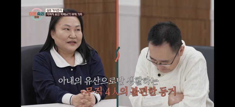 서장훈은 "성인 네 명이 있는데 네 명 다 일을 안 하는 거죠? 네 명이 다 아내의 유산을 까먹고 사는 거냐"고 황당해했다. 아내는 "(유산을) 다 써서 지금은 거의 없다"고 했다.