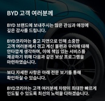 BYD코리아는 7일 홈페이지 안내문을 올리고 "출고 지연으로 고객이 겪고 있는 불편과 우려에 대해 안타깝게 생각하고, 책임 있는 서비스를 제공하기 위해 보상 프로그램을 마련했다"며 이러한 계획을 밝혔다.