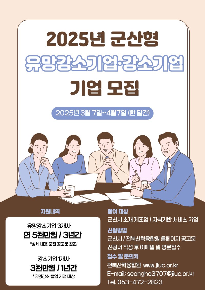 신청 자격은 군산시에 본사(공장) 또는 주사업장이 소재하고 창업한 지 3년 이상, 상시 근로자 10명 이상의 제조업 및 지식기반 서비스업을 하는 기업 가운데 전년도 매출액이 600억원 미만이어야 한다.
