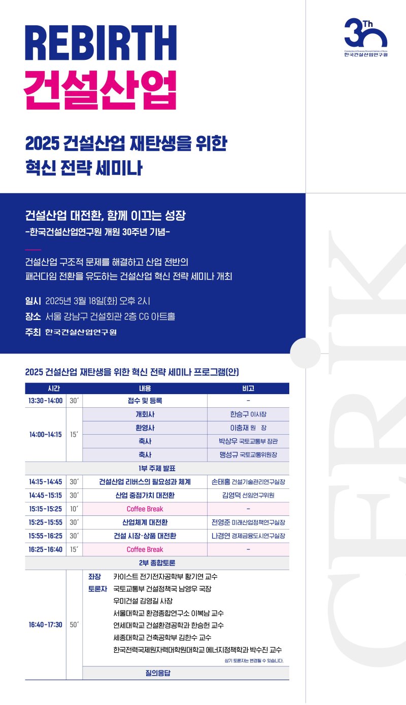 [서울=뉴시스] 박성환 기자 = 한국건설산업연구원(원장 이충재)은 개원 30주년을 맞아 오는 18일 서울 강남 건설회관에서 '2025 건설산업 재탄생을 위한 혁신 전략 세미나'를 개최한다고 7일 밝혔다.