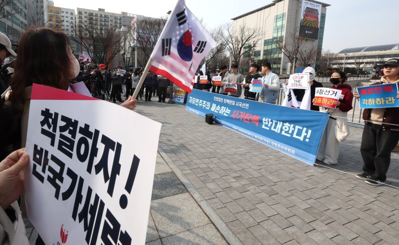 학생들은 '부정선거 검증하라' '불법탄핵 각하하라'라는 문구가 적힌 피켓을 들고 목소리를 높였다.