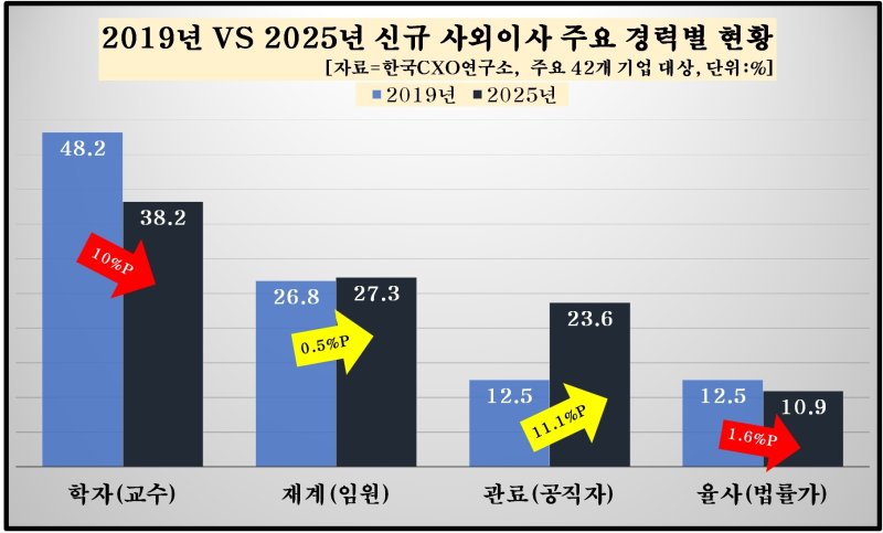 기업분석전문 한국CXO연구소는 10일 이런 내용을 담은 2019년과 2025년 신규 선임 사외이사 특징 비교 분석 결과를 발표했다. 이번 조사는 국내 50대 그룹 주요 계열사 등에서 6년 임기를 모두 채우고 사외이사를 의무 교체해야 하는 기업 중 이달 7일까지 이사회 소집 결의서 등을 제출한 42곳을 대상으로 했다.
