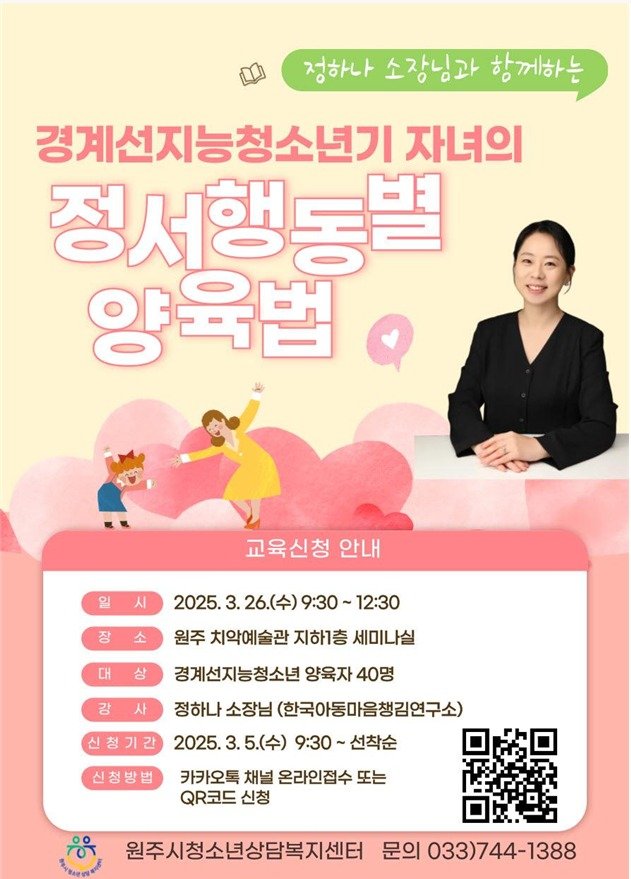 10일 원주시에 따르면 이 교육에선 정하나 한국아동마음챙김연구소장이 강사로 나선다. 정 소장은 학습과 사회성 발달에서 어려움을 겪는 경계선지능청소년 자녀의 특성과 그에 따른 양육 방법 등에 강의할 예정이다.