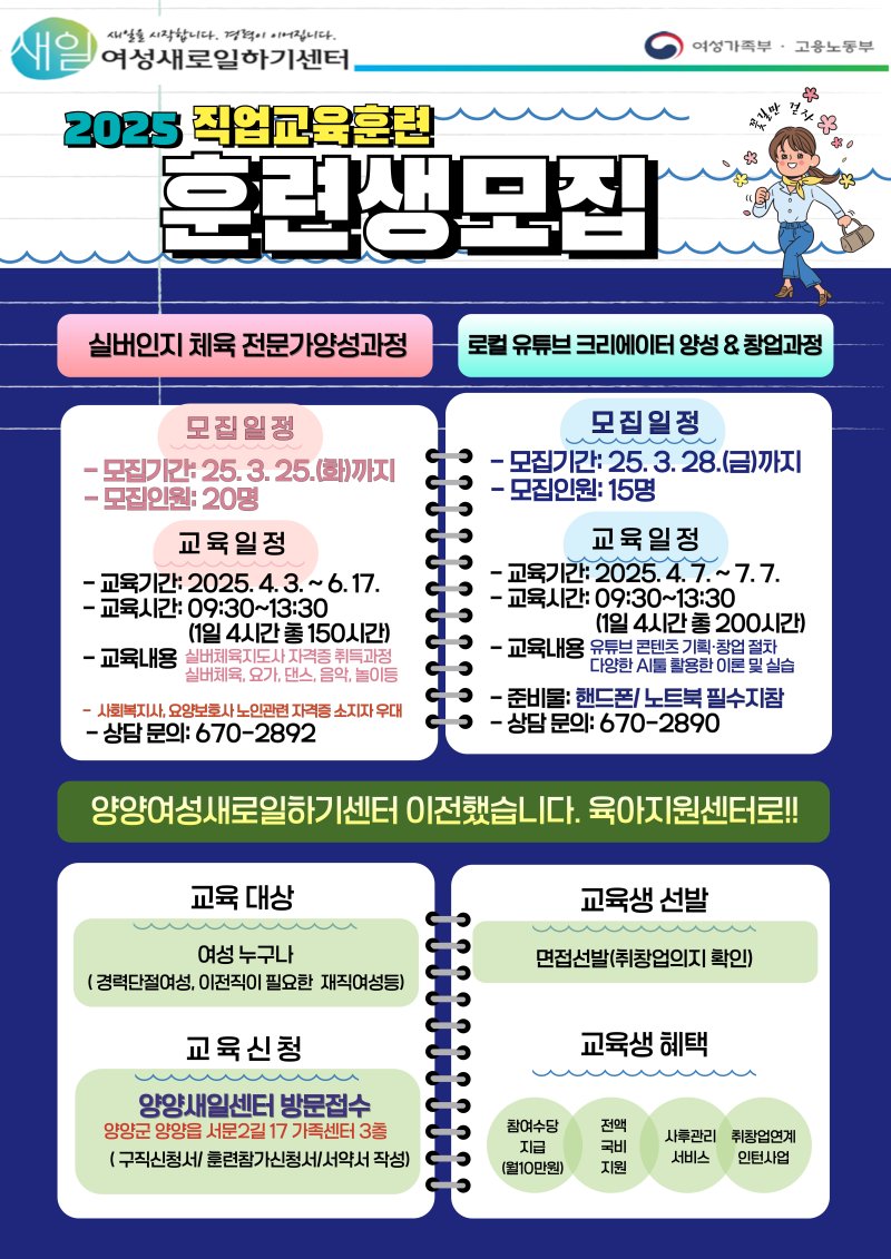교육훈련을 희망하는 여성은 양양군 홈페이지 공지사항에 게시된 모집 안내문을 확인한 후 각 과정의 모집일까지 새일센터에 방문해 신청서류를 제출하면 된다.