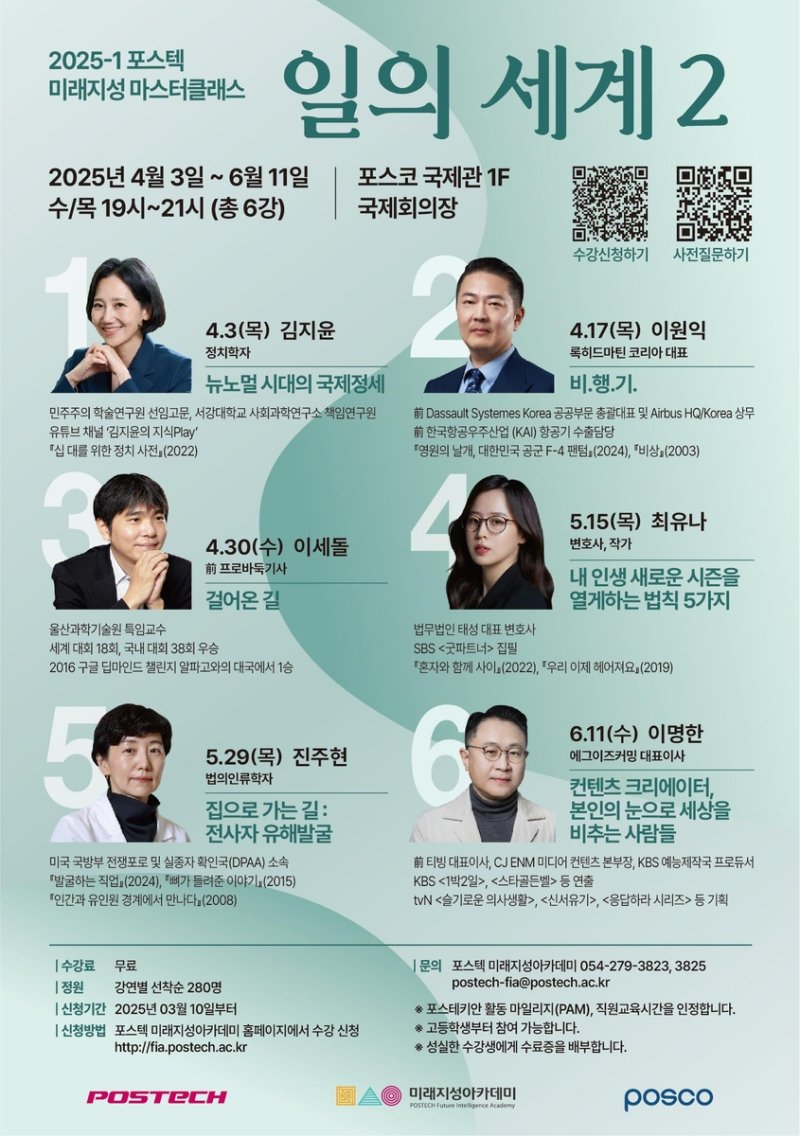 지난해에 이어 진행되는 이 강연은 6회에 걸쳐 김지윤 정치학자, 이원익 록히드마틴 코리아 대표, 이세돌 전 프로바둑기사, 최유나 변호사, 진주현 법의인류학자, 이명한 에그이즈커밍 대표가 강사로 나선다.