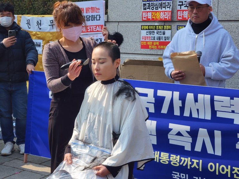 이 씨의 뒤를 이어 자리에 앉은 정 씨는 담담한 표정으로 머리를 밀었다. 중간중간 '탄핵 기각' 등 구호를 따라 외치기도 했다. 이런 정 씨를 엄마뻘로 보이는 50~60대 여성 집회자들은 안쓰러운 표정으로 지켜봤다.