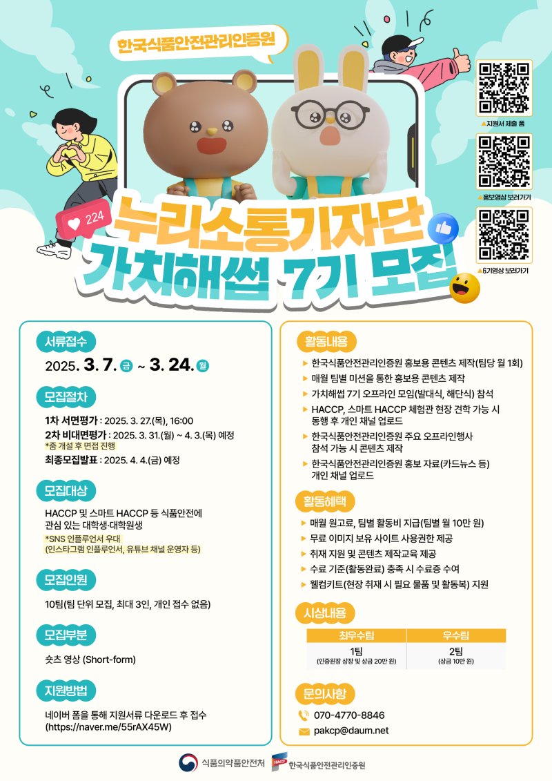'가치해썹 7기'는 해썹 및 스마트 해썹 등 식품안전에 관심 있는 대학생·대학원생 총 10팀(팀당 최대 3명)을 선발할 계획이다. 기자단으로 선발되면 4월부터 11월까지 월별 주제에 맞는 영상(숏폼) 제작 등 다양한 콘텐츠를 기획·제작하게 된다.