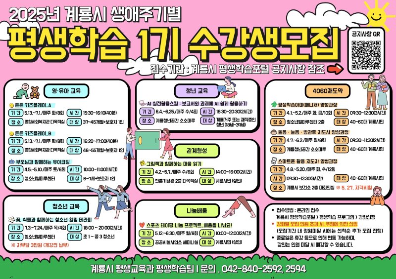(계룡=뉴스1) 송원섭 기자 = 충남 계룡시는 지역 평생교육 활성화 및 지속가능한 평생학습도시 조성을 위해 ‘2025년 1기 생애주기별 평생학습 프로그램’을 오는 4~7월 운영한다고 10일 밝혔다.