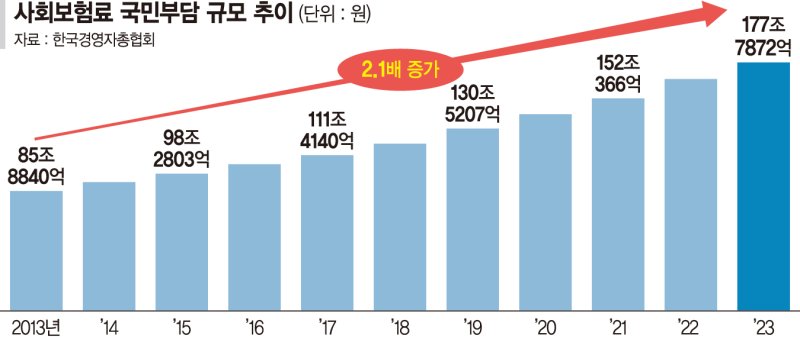 10일 경총이 발간한 '5대 사회보험 국민부담 현황과 정책 개선과제' 보고서에 따르면 지난 2023년 한국 국민이 부담한 5대 사회보험료는 총 177조7872억원이다. 2022년 165조9969억원 대비 7.1% 증가한 수치다.