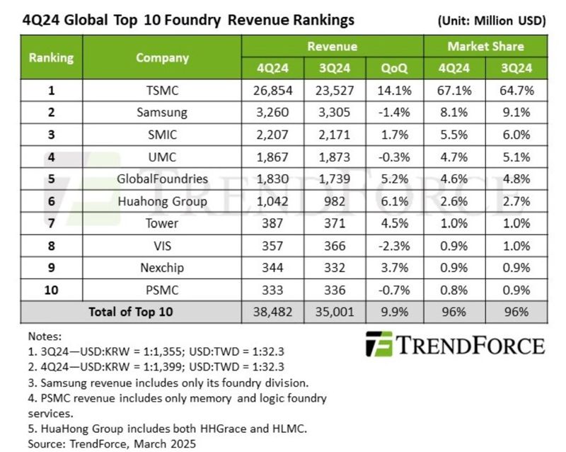 트렌드포스는 "인공지능(AI) 서버, 플래그십 스마트폰 애플리케이션 프로세서(AP), 새로운 PC 플랫폼의 강력한 수요에 힘입어 TSMC의 웨이퍼 출하량이 증가했다"며 "삼성전자는 신규 첨단 노드 고객사들의 매출이 기존 주요 고객사의 주문 손실을 완전히 만회하지 못해 매출이 소폭 감소했다"고 설명했다.