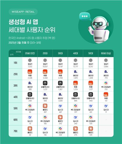 지난 달 15일부터 신규 앱 다운로드가 중단된 중국 딥시크는 30대 이용자가 4만6천700명, 20대 1만5천600명 등 모든 연령대에서 5위 이하에 머물렀다.