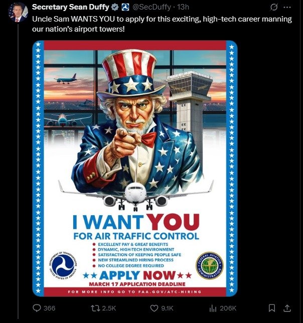 숀 더피 미국 교통부 장관은 10일(현지시간) 자신의 사회관계망(SNS) 엑스(X)에 "엉클 샘은 당신이 공항 관제탑 관리라는 흥미로운 직업에 지원하기를 기다리고 있다"며 포스터 한 장을 올렸다.
