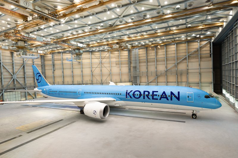 신규 CI 공개에 이어 격납고 뒤편을 가리고 있던 천막이 걷히며 새 CI를 입힌 보잉 787-10 항공기가 등장했다. 프레스티지 스위트 2.0 등 새로운 기내 인테리어를 적용한 신형기 HL8515다. 이 항공기는 12일 오전 인천에서 일본 도쿄 나리타로 향하는 KE703편에 투입될 예정이다.