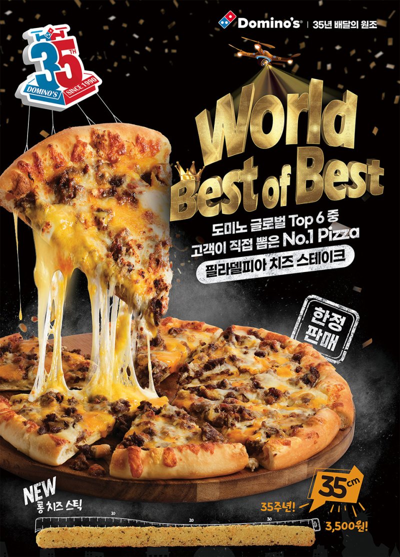 이와 함께 도미노피자는 이번 신메뉴 출시와 함께 35주년을 기념해 35㎝의 쫄깃하고 고소한 치즈를 가득 채운 '35cm 롱 치즈 스틱'도 출시해 필라델피아 치즈 스테이크 피자와 동시에 즐길 수 있게 했다.